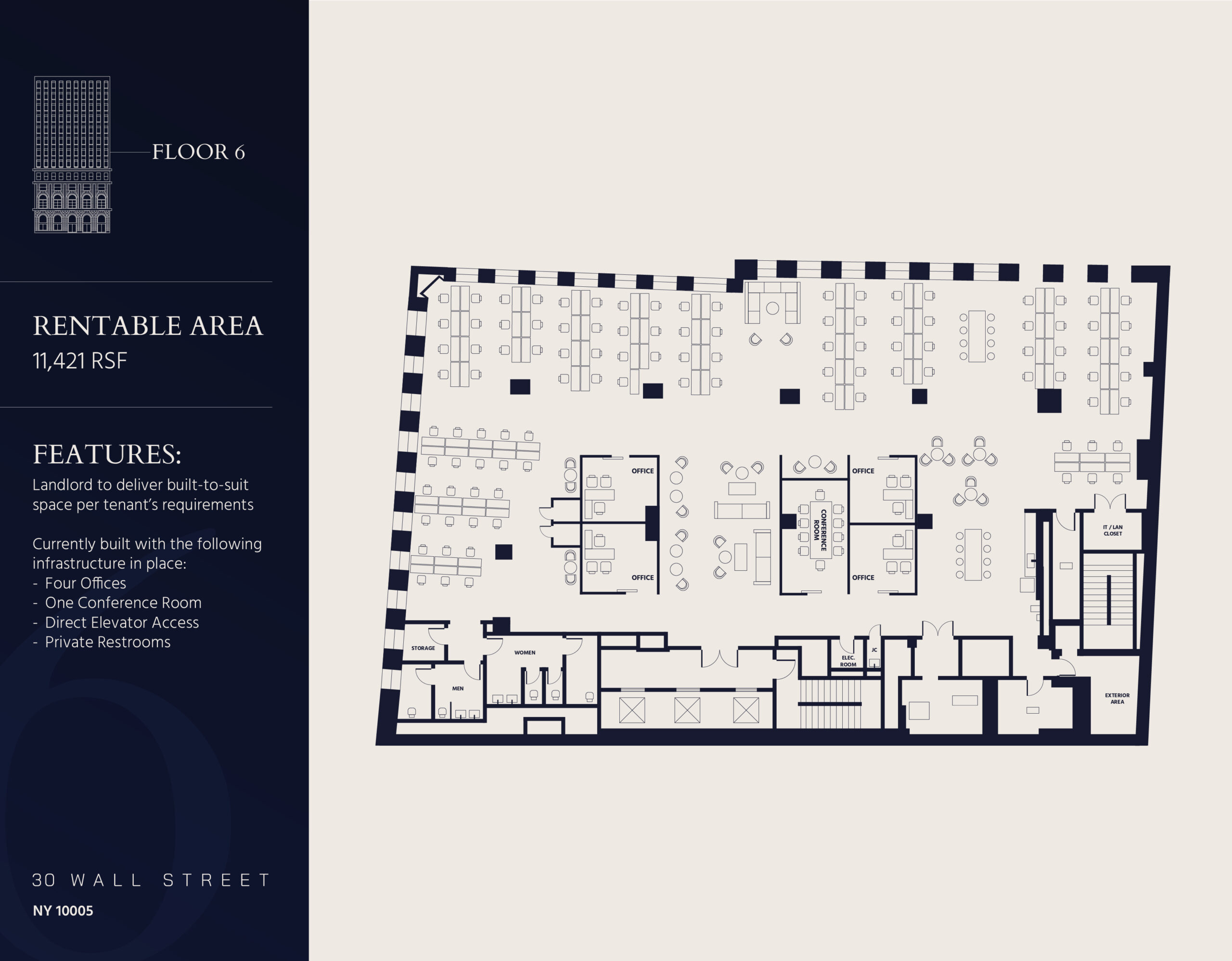 Directly next to Federal Hall and across from the New York Stock Exchange, 30 Wall Street is surrounded by world-class retailers, including Equinox, Hermes, Printemps, Whole Foods and Tiffany & Co. Just one block from major transportation, it offers seamless connectivity in a prime Financial District location.